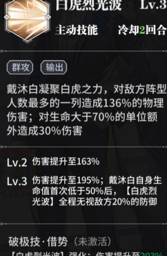 一技能释放白虎烈光波,对前方敌人造成直线伤害,当戴沐白生命首次低于50%时,附带无视20%防御效果。