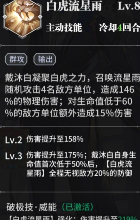 二技能释放白虎流星雨,随机攻击四名敌人,戴沐白首次生命低于五成时,无视目标两成防御。