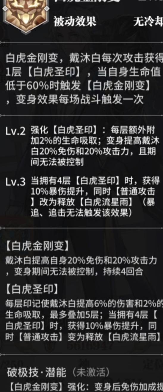 四技能:白虎金刚变,可提升20%免伤与20%攻击力,变身期间免疫控制。每次攻击积攒一层印记,每层增加2%吸血与6%伤害,叠满4层后额外获得10%暴击伤害,且普攻将变为白虎流星雨。