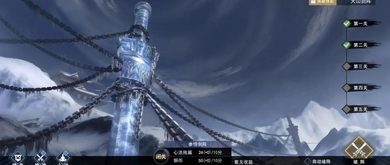 在天山剑阵中,玩家可获得用于侠客升级和心法提升的心法材料及铜钱。该副本为单人挑战,不可组队,排行榜依据通关层数进行排名。