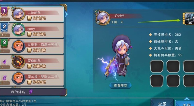 进入佣兵界面后点击排行榜,可查看排名,点击头像即可获取详细信息。