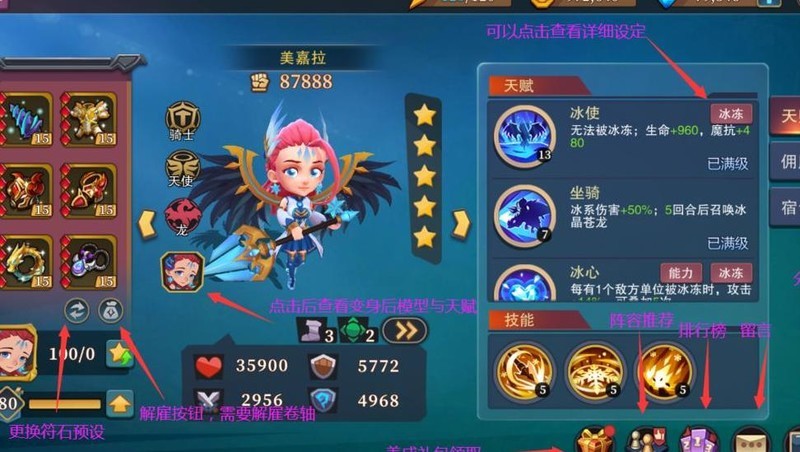 美嘉拉与龙女均拥有变身能力,点击红圈可提升变身后的天赋技能。