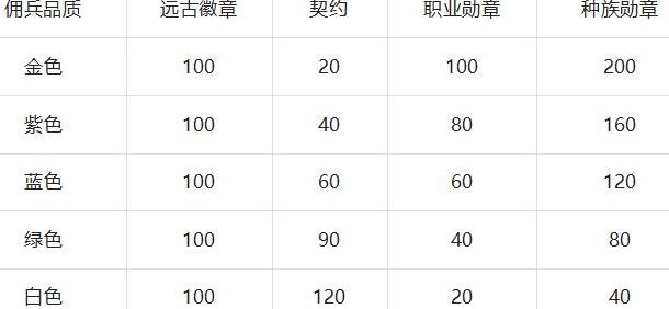 佣兵契约数量:金色20、紫色40、蓝色60、绿色90、白色120。