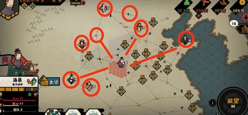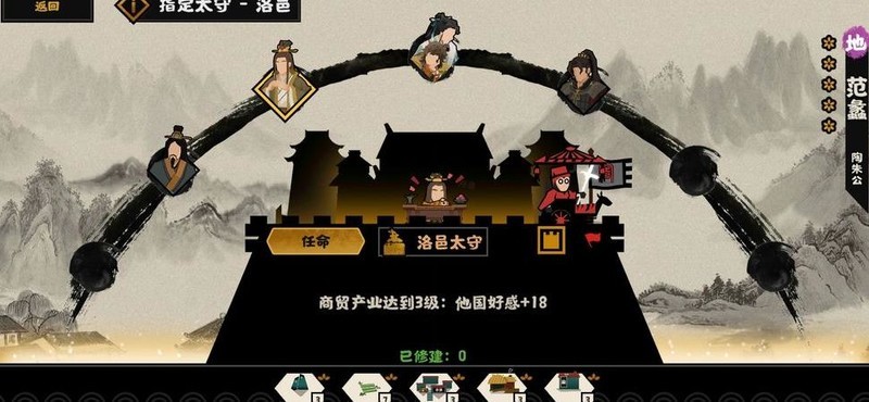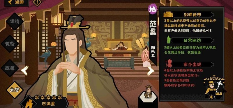 可搭配范蠡与陈平,利用其太守技能(装备能增强效果);若太守等级不足,亦可借助张仪或西施提升他国好感度,灵活组合使用。