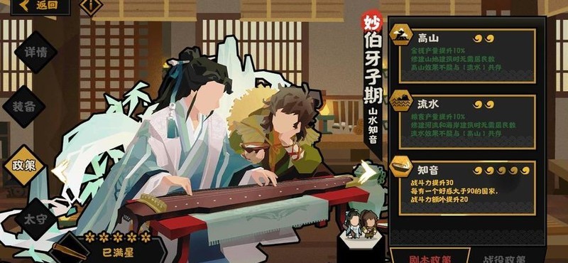 伯牙子期依赖好感度提升战力,需配合增加好感的名臣,借助多国势力转化更强战斗力,形成协同效应。