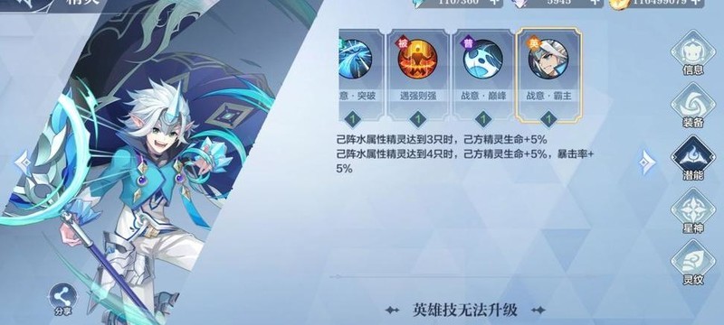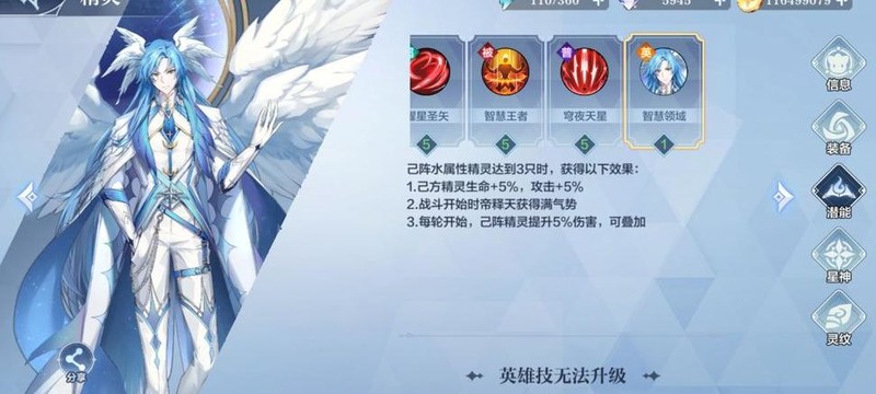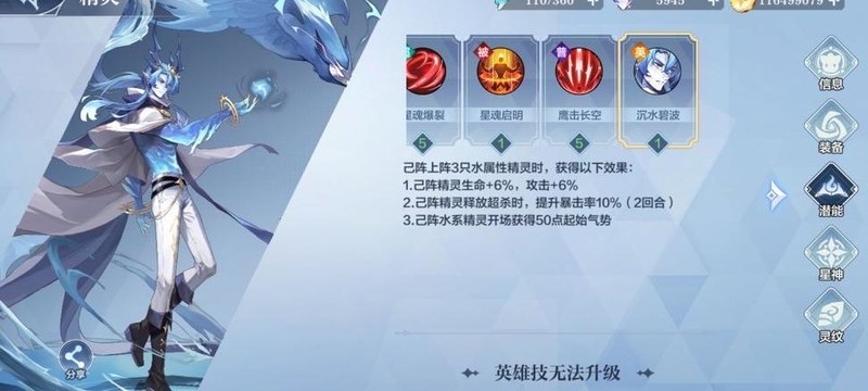 英雄技以智慧圣魂为核心,上阵包含该精灵在内的三只水系精灵即可激活。战斗开始时,己方阵容中的火系精灵获得50点气势加成,且每次释放超杀技能后,全队暴击率提升10%。该阵容的优势在于第二回合能迅速集火,打出可观伤害,凭借高爆发的单体输出,通常可清除敌方前排与后排大半兵力。然而其劣势也明显,首回合仅依赖普攻输出,若核心输出单位在敌方先手攻击下被迅速击杀,则后续难以组织有效反击,极易陷入被动挨打的局面。