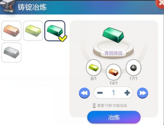 将材料带回家园,前往熊猫师傅的铁匠铺,选冶炼功能中的铜锭,耐心等待熔炼完成即可。