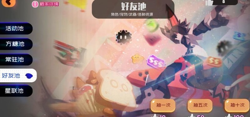 完成新手任务后可继续推进主线剧情,期间会赠送一次常驻池十连抽机会,该池即为好友池。首次抽取必得一张超稀有角色。非限定卡池的抽卡券可直接使用,建议优先保留,不要消耗果冻进行抽取。游戏中各途径获得的果冻抽卡券均用于此好友池,通过好友点赞累计满10次也可获得一次抽取资格,这是获取SSS级角色的主要方式之一。需注意,游戏内标名为常驻池的另一个卡池实际性价比极低,基本无需考虑,可忽略其存在。