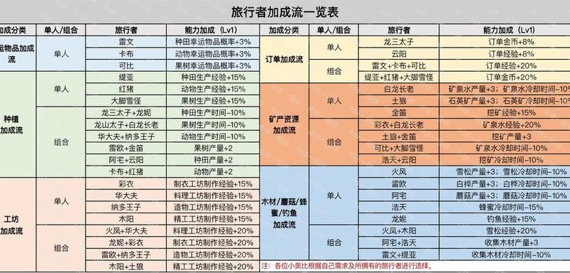 依据旅行者单人及组合的不同增益效果,划分为六大类别(所列属性加成均为初始等级数值)。