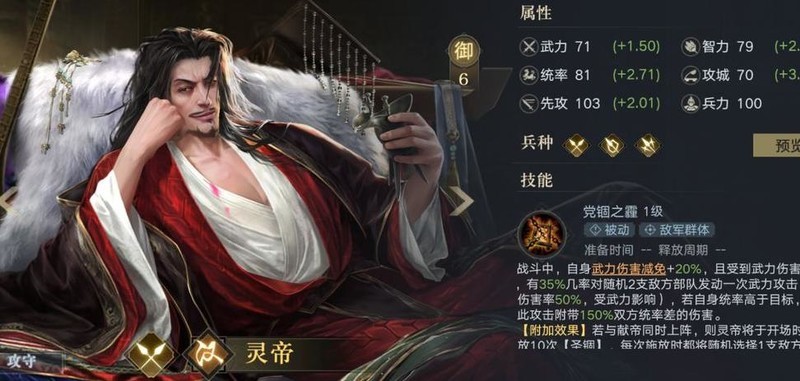 从基础属性来看,灵帝的表现并不算亮眼,统率初始值为81,在众多武将中处于中等偏下水平。然而其统率成长系数高达2.71,位列顶尖梯队,使得最终统率值达到较高水准,排名全武将第11位,紧随统率前十之后。作为枪兵武将,他在攻城方面具备一定优势,满级时先攻数值可达201.49,刚好跨过第三梯队门槛(第一梯队300以上,第二梯队250以上,第三梯队200以上),虽不算突出但尚可接受。综合各项面板数据,灵帝的整体属性大致处于T2级别,属于中上游水平。不过,这仅是从基础属性角度出发的评估,实际表现还需结合技能、阵容搭配等多方面因素综合考量,并不能单凭面板定论其强弱。