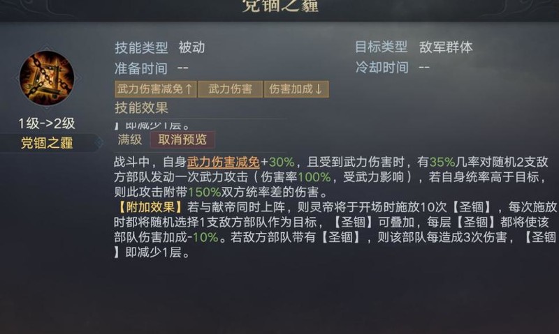 当灵帝与献帝一同出战时,战斗开始阶段灵帝会连续释放10次,每次随机选定一支敌军为目标。效果可叠加,每层使目标部队的伤害加成降低10%。若敌方部队处于状态,每当其造成3次伤害后,层数便会减少一层。该机制有效削弱敌方持续输出能力。