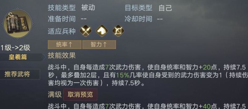 满级时,每造成7次武力伤害,自身统率与智力提升40点,持续7.5秒,最多叠加两层;同时有30%概率使受到的武力伤害变为1点(所有持续伤害计为一次),效果持续7.5秒。