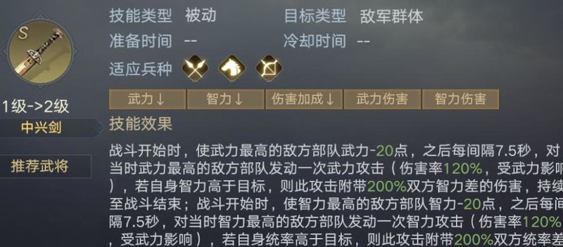 每7.5秒对智力或武力最高的敌方武将发动攻击,若自身统率或智力超过目标,额外造成相当于两者差值200%的伤害,此特效使中兴剑特别适合属性均衡且智力、统率较高的武将,如诸葛亮等。