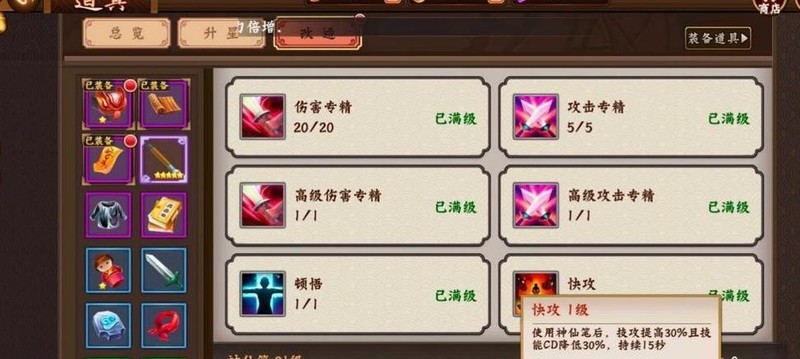 神仙笔与赤兔鞍的培养效果基本一致。伤害专精及其高级形态可在提升道具伤害的同时增强武将普通攻击的伤害加成;攻击专精及其高级版本则同时提高普攻与技能攻击的伤害加成。顿悟能增加道具的使用次数,快攻则在使用道具期间持续提升技能伤害并缩短技能冷却时间,整体效果较为隐蔽但实用性强。