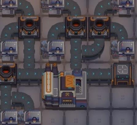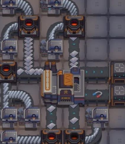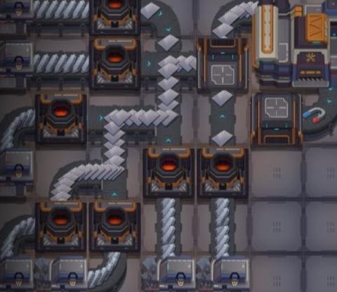 该布局由七组熔炉组合而成,虽效率略低,但适应性强,适合后期接入大型流水线使用。箱子对整体效率无影响,因物品溢出与占地相互抵消。前期可省略箱子,后期则必须添加,因材料价值提升,溢出物品可回收,不足时可手动补足,避免效率下降。