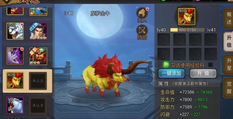 玩家通过狩猎场获得的普通橙色蛮牛,在未觉醒前仅具备生命、攻击和防御等基础属性提升,与未觉醒的三神兽相似。当消耗约350颗战宠内丹完成觉醒后,橙色蛮牛将立即激活闪避与爆伤免疫两项高级特性,并解锁全新技能。觉醒后的蛮牛外形发生巨大变化,三花聚顶、火眼赤鬃、金角铁蹄,彻底蜕变为上古神兽——摩罗金牛,整体实力大幅提升,成为战场上的强力伙伴。