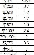将伤害目标划分为步兵、骑兵、弓兵、炮兵及建筑五类。由于除炮兵外其他兵种通常不以建筑为主攻对象,可近似将50%全增伤对应的5分拆解为:四大兵种各占1.2分,建筑占0.2分。据此推算各类增伤属性的得分,结果所示。