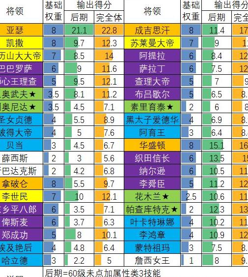 评分反映将领在所属指挥官体系中的平均输出能力,属理想化参考指标,实际表现受敌方兵种影响可能有所浮动。
