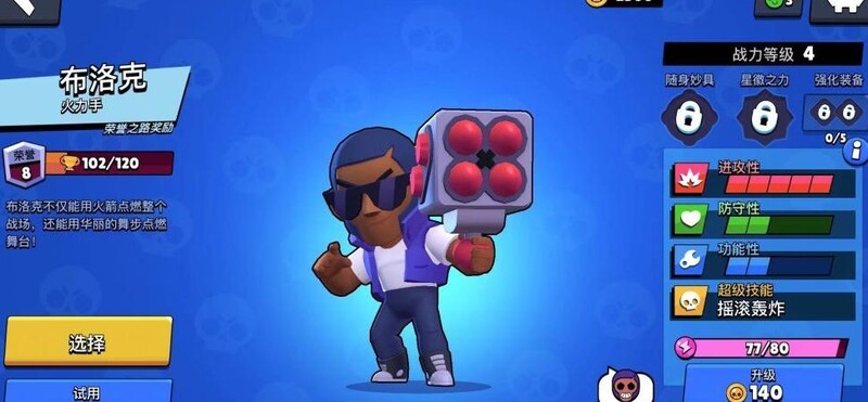 优点:尽管射击角度有限,但具备连发特性,能在交火中持续输出,命中数发以提供有效火力支援。缺点:缺乏角度外的压制手段,难以逼迫对手走位,自身缺乏逃生能力,面对大面积草丛时显得被动。火箭男Brock是一名操作难度较高的狙击型英雄,拥有极远射程,常可实现屏幕外击杀。因其技能依赖预判,对网络延迟相对不敏感。擅长远程狙击与压低敌方血量,大招威力强大,尤其适用于Smash & Grab抢水晶模式及Bounty赏金模式,在需要精准打击和战术布局的场景中表现突出。