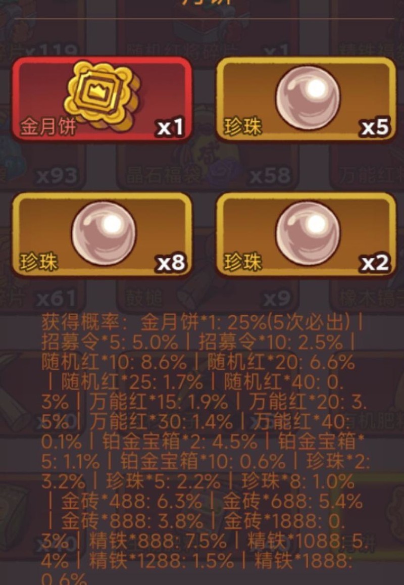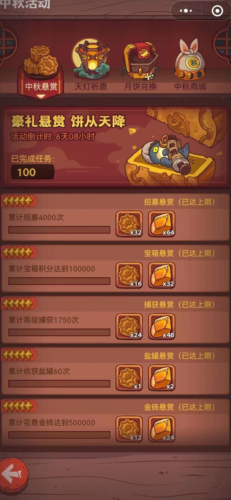 完成悬赏任务可获得月饼,每开有25%概率得金月饼,最多五次必得一个,集齐后可用于兑换金鱼。