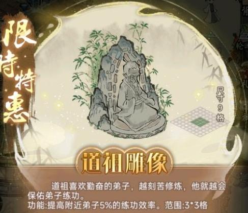 道祖雕像可使周边弟子练功效率提升5%,需占用3×3格空间。