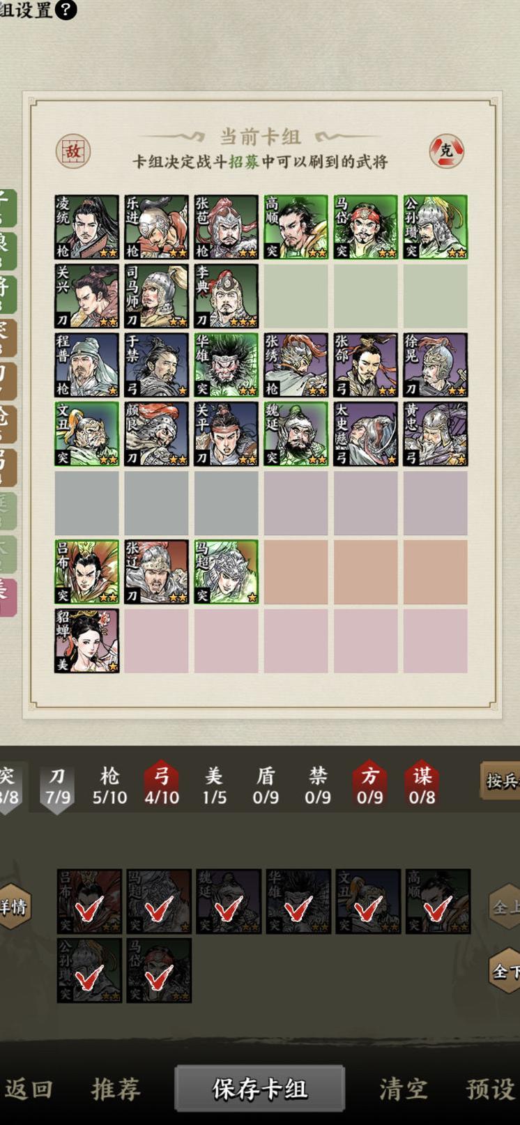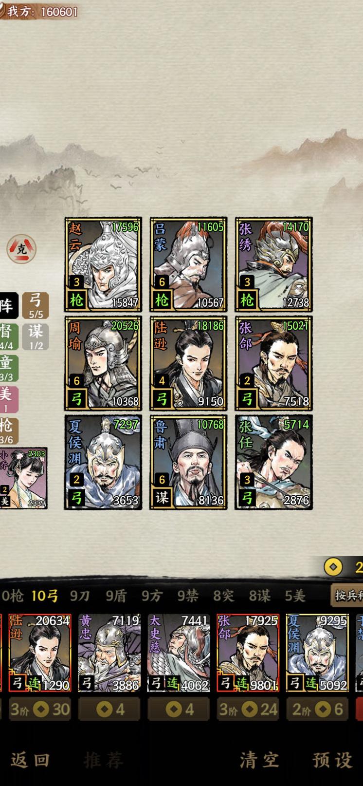 前期推图推荐三枪四督阵容,成型后转为三枪五弓一谋士。站位灵活调整,大致为赵云、吕蒙、张绣、周瑜、陆逊、张郃、夏侯渊(或太史慈)、另一吕蒙、张任,搭配小乔。开局优先选取赵云令牌,先以三枪三弓过渡,注重卡利息升级和免费刷新武将。七人口时争取免费抽到童渊、三枪三弓,平稳过渡至八人口凑齐主力阵容,视情况上九,持续卡利息追三星五费将,提升整体战力。