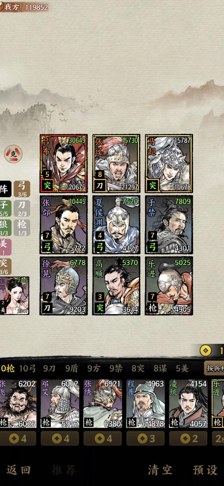 后期若童枪四都督阵容难以取胜,可转型为五子良将搭配并州凉骑的三突三弓体系。核心武将包括吕布、张辽、马超、张郃、太史慈、于禁、徐晃、高顺、乐进,并辅以貂蝉增强控制。吕布具备强力秒杀能力,配合张辽带来的续航与貂蝉的控场效果,能有效突破多数关卡。前期优先用吕布带高顺过渡,尽量多攒利息。当对手成型至三人或四人时,抽到张辽后补上一名突骑协助输出。视情况在50或30金币停留刷牌。七至八人口时搜出三突三弓或凉骑与五子组合,九人口或升十级时再免费搜齐完整阵容,确保战力成型。