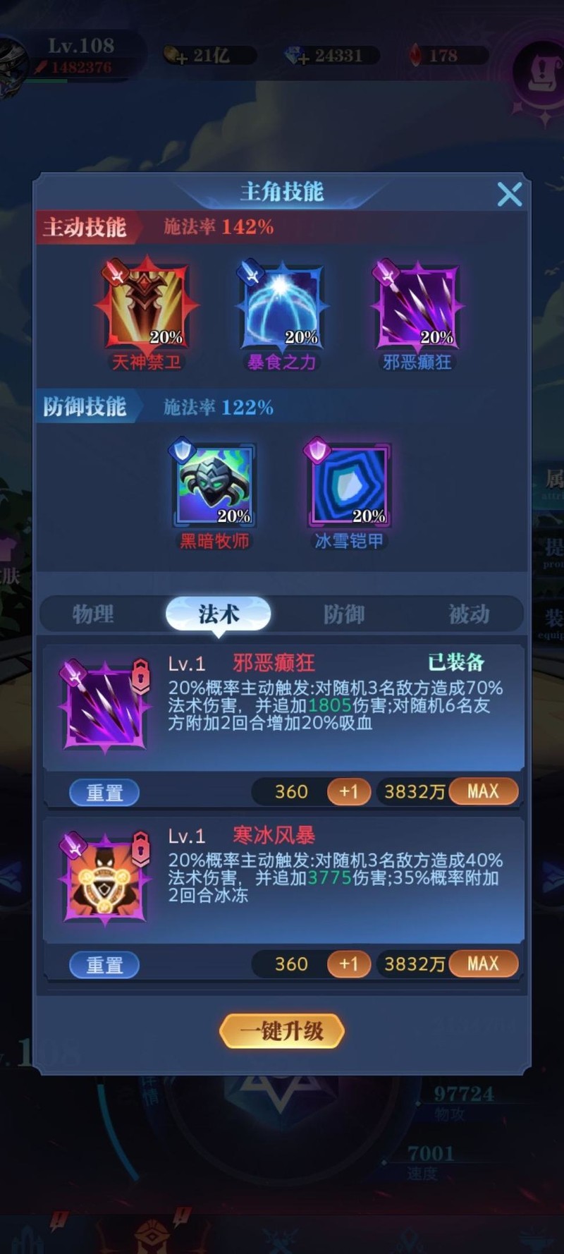 主角多数情况下依赖天神技能,配合圣光希勒、正义暴怒等增益状态,常用暴食刷经验,猪系角色主吸血,天神与暴食使用频率最高。