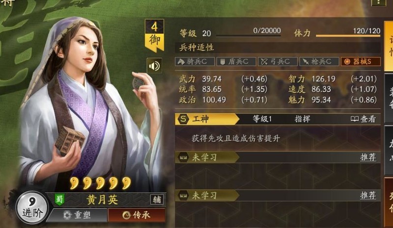 黄月英在游戏中拥有S级器械兵种适性,但其余兵种均为C级,若不担任器械兵出战,属性将降低30%。她的智力和速度处于中等偏下水平,统率勉强达标,武力则几乎可以忽略。由于上阵后属性进一步削弱,实际智力与速度已低于及格线,难以胜任依赖属性输出的战法。因此,她更适合搭配不依赖属性加成的辅助类战法,在阵容中发挥功能性作用,而非作为主力输出或前排担当,定位偏向特定场景下的支援角色。