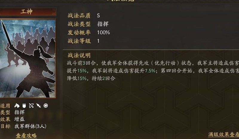 黄月英虽基础属性平平,但其自带战法工神极为强势。前三个回合赋予我方全体先攻状态,并提升伤害输出,极具爆发力;从第四回合起,敌方所受伤害降低15%,持续两回合,有效遏制对手反扑。该技能特性使其成为先手阵容的核心辅助,尤适配高爆发武将组合。常见的三势吕阵容便常由她担任辅助位,前三回合迅速压制对手,后期稳步推进,掌控战局节奏。