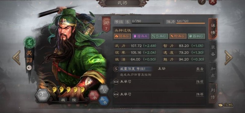 关羽骑兵与枪兵适性均为S级,盾兵达A级,兵种适应性强,作战应用广泛。