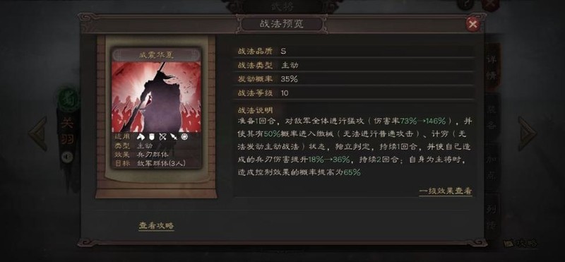 关羽的自带战法兼具高伤害与强力控制,具备全体攻击能力,基础伤害可观,控制效果涵盖缴械与震慑,整体表现十分强势。改版后即便作为副将,也能享受兵刃伤害加成,进一步提升了输出能力。缴械与震慑为独立判定机制,显著增强了控制覆盖率。然而,该战法释放概率仅为35%,且需准备一回合,导致实际发挥存在不稳定性。因此,如何有效提升战法的发动频率与稳定性,成为充分发挥关羽实战效能的关键前提。