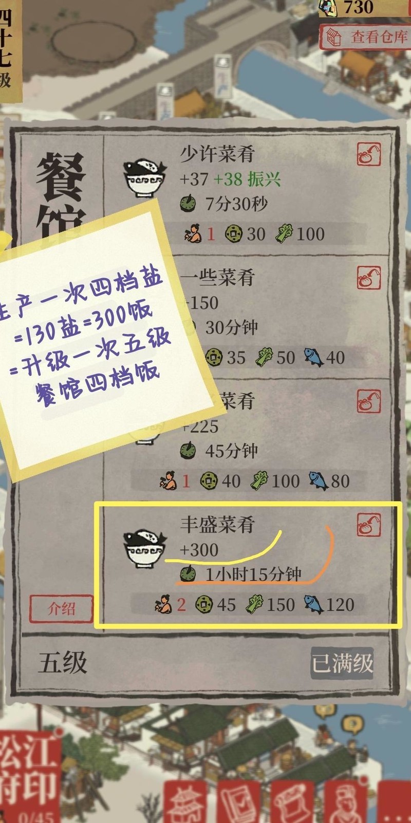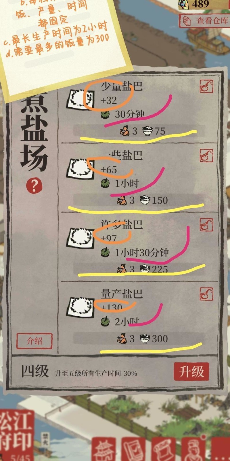 四档最多耗时两小时,需三人,耗粮三百,产盐一百三十。