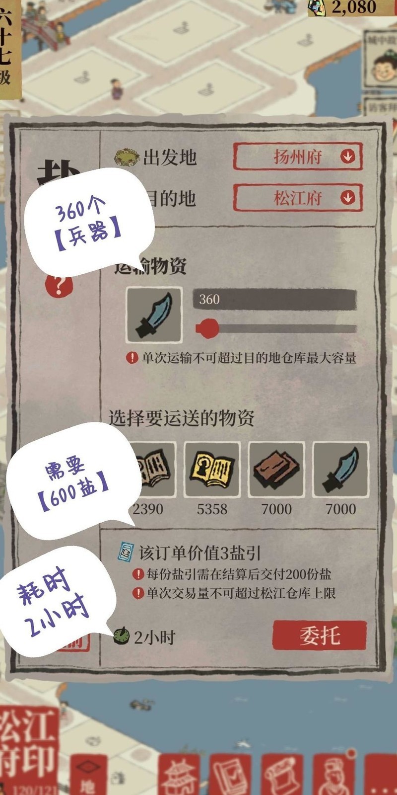 盐量不足100时,运送360件兵器需2小时,交付3份盐,随后计算600除以139得3.07。
