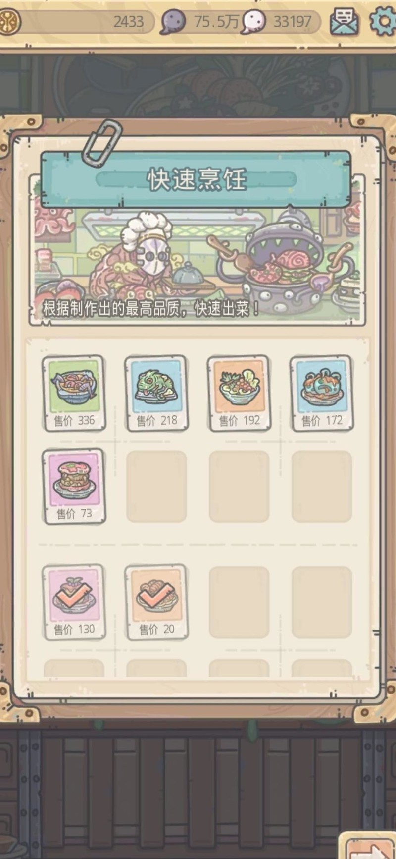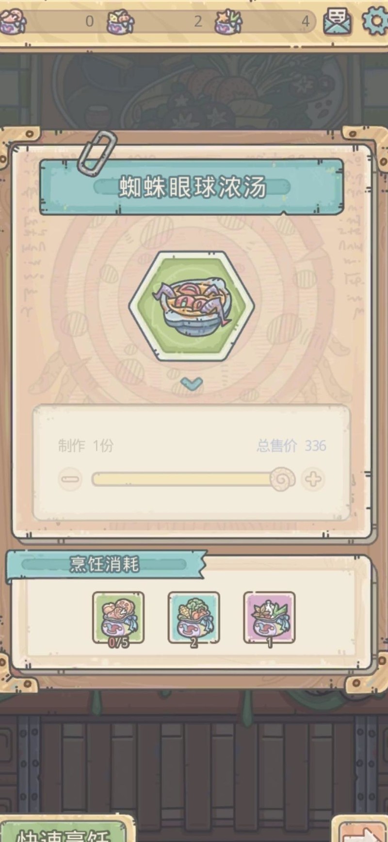 例如这款绿色品质的蜘蛛眼球浓汤,需5个绿色、2个蓝色和1个紫色材料,共8种。制作完成后可售出336美食币,相当于每个材料平均产出42美食币。相较基础收益20而言,显然更具利润空间,投入回报更高,值得优先制作与出售。
