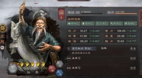 左慈(约156年-约289年),字元放,庐江人,汉人,道号乌角先生,东汉末年著名方士。早年隐居天柱山,潜心修习炼丹与道法,精通五经、天文星象,熟谙遁甲之术,相传可驱使鬼神,召来行厨,事迹充满神异,后汉书称其少有神道。在兵种属性方面,其武力、统率等数值均极低,唯智力尚可,各项兵种适性皆为C级,表现平平。幸而其仙人特质具备特殊效果,可在战术搭配中灵活运用,弥补面板不足,成为多战组合中的关键解析角色。