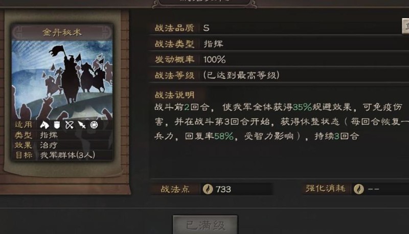 左慈的专属战法金丹秘术可在战斗前两回合使我方全体获得35%的规避效果,有效免疫各类伤害;从第三回合起,持续三回合进入休整状态,每回合恢复一次兵力,回复率为58%,且受智力属性加成。目前游戏中仅存在两种免伤机制:规避与抵御,其中规避不仅能完全闪避攻击,适用范围更广,因此整体表现优于抵御,战略价值更为突出。