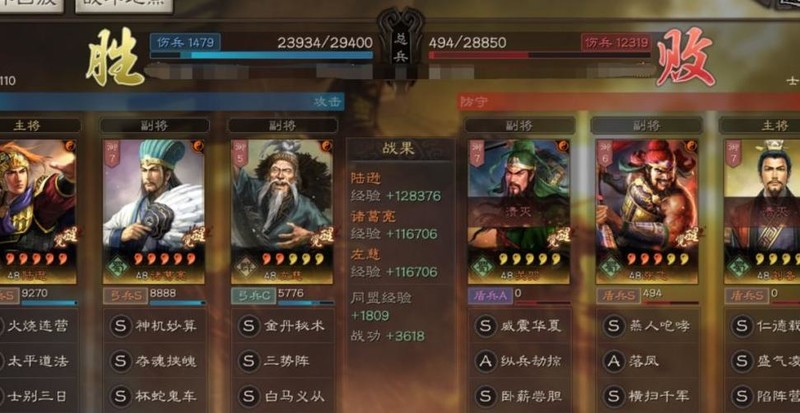主将陆逊携带士别三日与太平道法,兵书选择大谋不谋、鬼谋、将威;副将诸葛亮搭配夺魂挟魄和杯蛇鬼车,兵书为严阵以待、防备、铁甲;副将左慈配置三势阵与白马义从,兵书选用援其必攻、励军、散仙。
