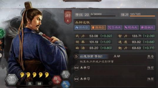 法正属性整体均衡,统率成长偏低但初始值较高,智力达标法师标准,速度表现尚可。兵种适性为盾S、弓枪A,搭配灵活,骑B则较少使用。