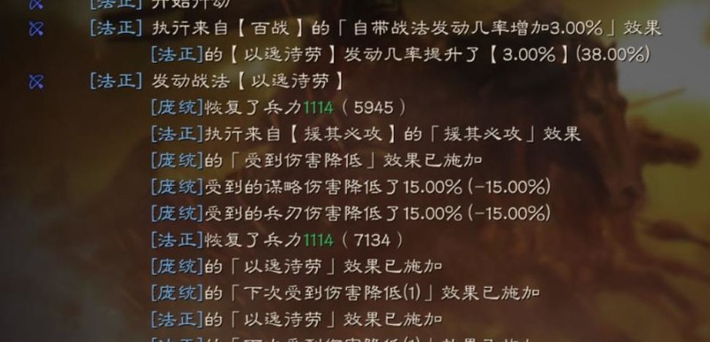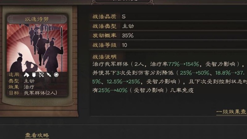 自带战法以逸待劳具备多重辅助效果:可为我方两人恢复兵力,治疗率为154%,受智力属性加成;同时使目标接下来三次受到的伤害依次降低50%、37.5%和25%,减伤效果同样受智力影响;此外,当目标下次遭遇控制状态时,有40%几率免疫该控制,概率也随智力提升而增加。这一战法集群体治疗、多段减伤与控制抵抗于一身,综合能力极强。其154%的群体治疗率在同类技能中位居前列,与婴城自守相当。实战中,在兵力充足的情况下,治疗量通常可达1100左右。满红弓兵A级法正的实际治疗表现略优于白板盾兵S级法正,展现出更高的辅助效能。