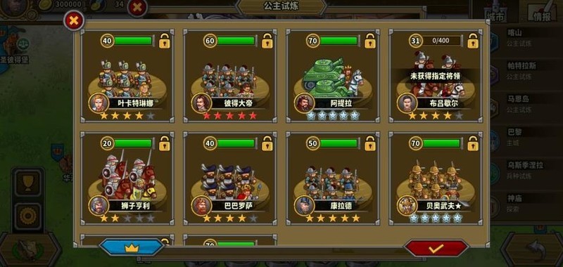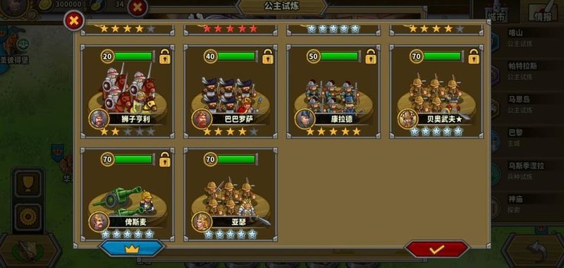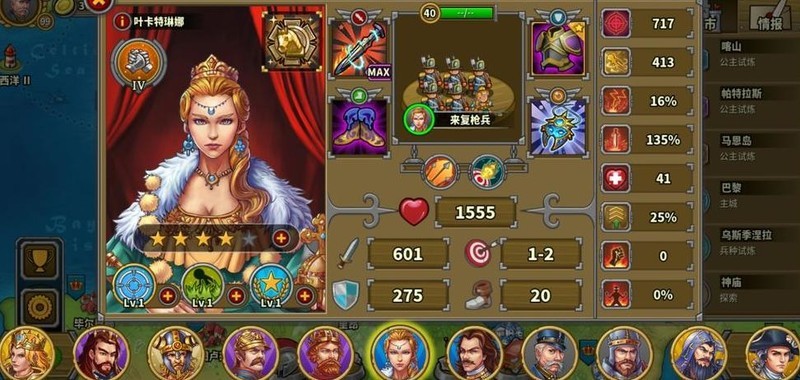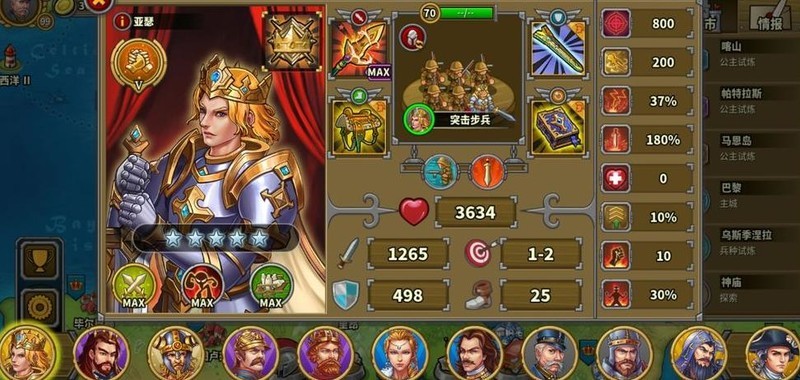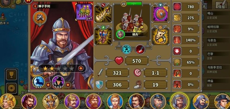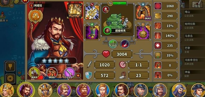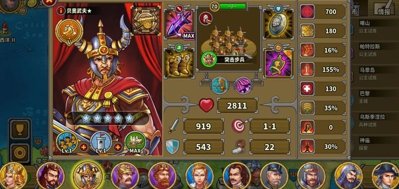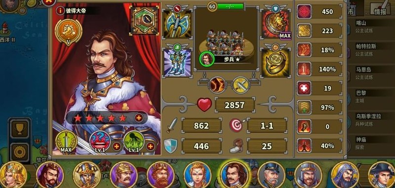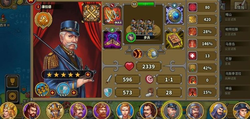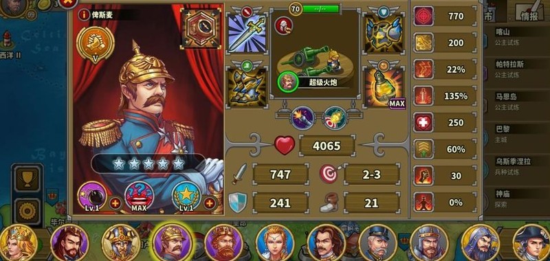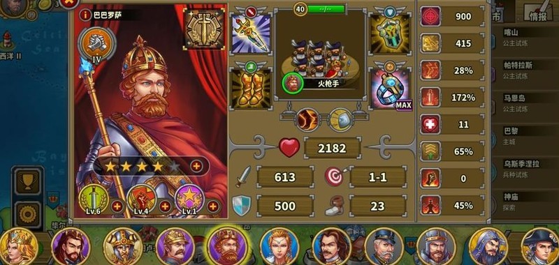 拥有四位7星英雄,彼得大帝为6星10级指挥官,巴巴罗萨4星6级但生存较弱未发挥领导力,其余角色尚未培养。