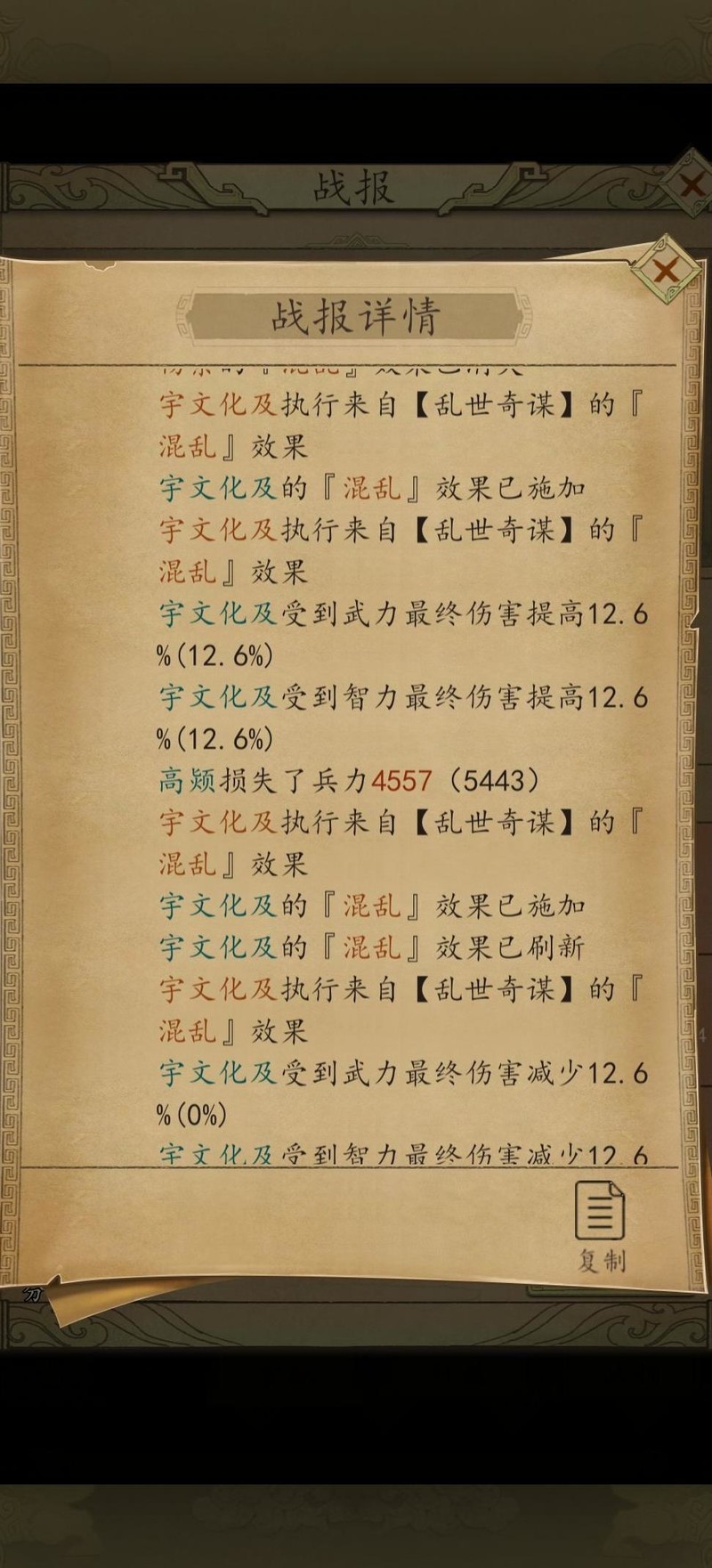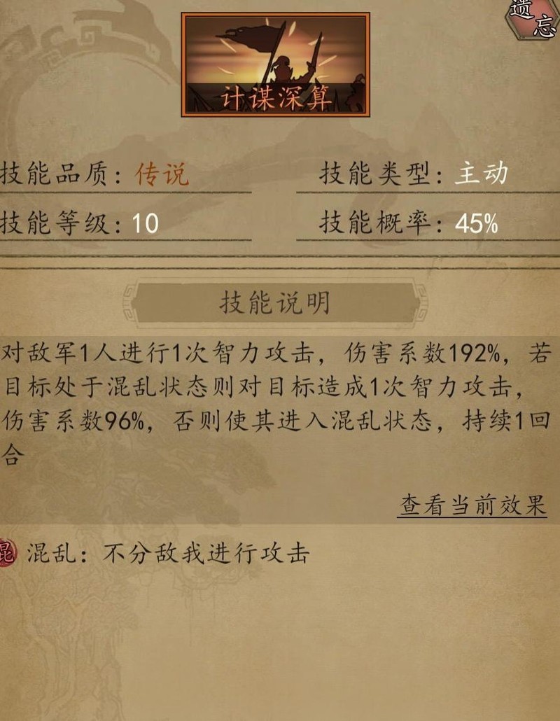 乱世奇谋:对除自身外的所有敌我单位依次判定。若目标未陷入混乱,则有35%几率使其陷入混乱状态,持续两回合;若己方单位已处于混乱状态,则清除其由主动或追击技能引发的负面效果,并在宇文化及为主将时,使其造成的伤害提升12%(受施法者智力影响),持续两回合;若敌方单位已混乱,则对其发动一次智力攻击,伤害系数为175%,随后额外使一名敌军陷入混乱状态。