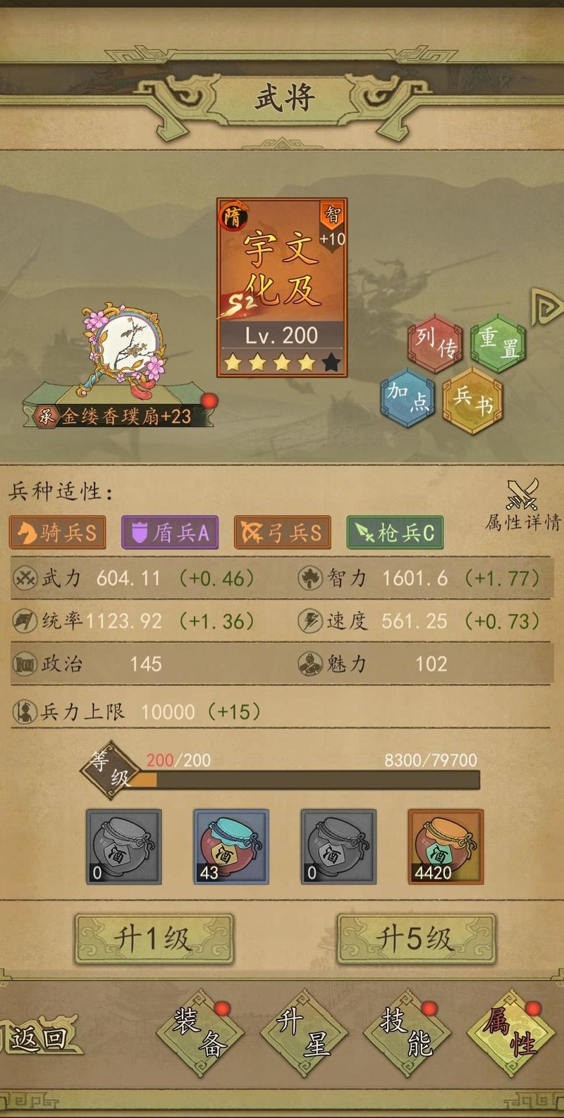 宇文化及与房玄龄相似,智力和统率突出,武力与速度偏弱,其顶级智力面板数值约为2200。