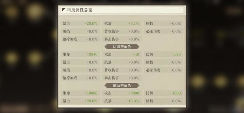 科研辅助的各项属性如攻击、暴击、防御、血量、抗暴、格挡均已满配,但因资源优先投入主攻角色的暴击与攻击,导致辅助的格挡升级受限。