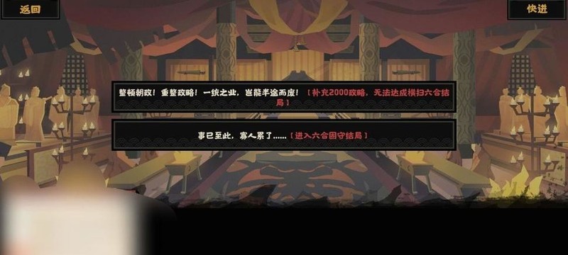 这个方法其实已有不少人提及:开局先耗尽301政略,再领取2000政略奖励,随后利用诸侯咸服结局来避开步步为营无法席卷的问题。凭借这2000政略,即便在无名臣挑战模式下也能顺利通关。经实际测试,无需依赖任何名臣配置即可达成通关目标,操作可行性较高。