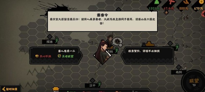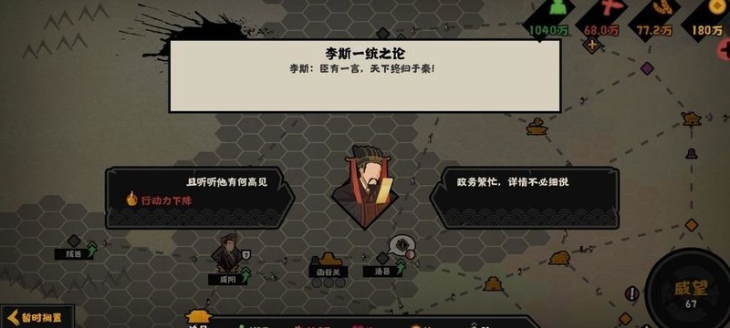 在六合剧本中,会先后触发统一论和逐客令两个事件。其中,只有逐客令与招募李斯相关。尽管统一论先出现,但忽略它不会影响后续进程,只需在逐客令事件中及时处理李斯的相关选项即可顺利招募。