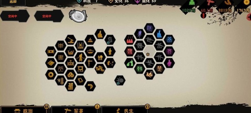 接着优先点击军事和名臣政策(此处未携带名臣),尽管全力投入仍难以填满军事槽,无需担心。随后切换至水利政策(民生类),即可继续推进。过程中注意预留约100点资源,以应对突发情况。