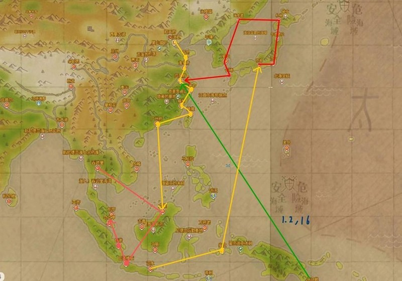 东南亚红色航线:吞武里、文莱、巴达维亚、巨港至马六甲,全程约45万。