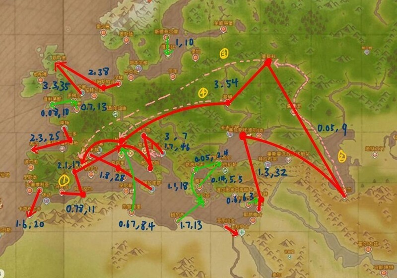 统计了各商路的名望与金币收益,因欧洲区域名望加成最高,故以欧洲为主。每条路线均用蓝字标注声望与收益(单位:万,格式:声望,收益)。未作特殊标记的路线仅交易推荐商品,按买卖顺序执行。