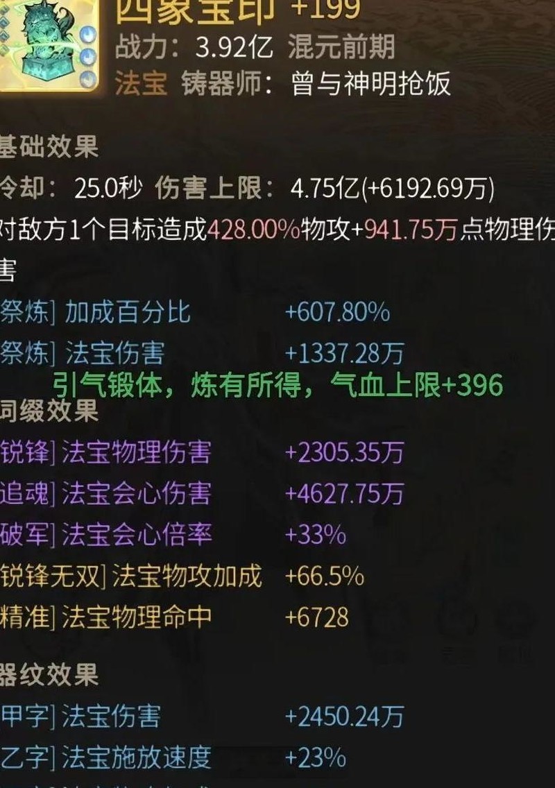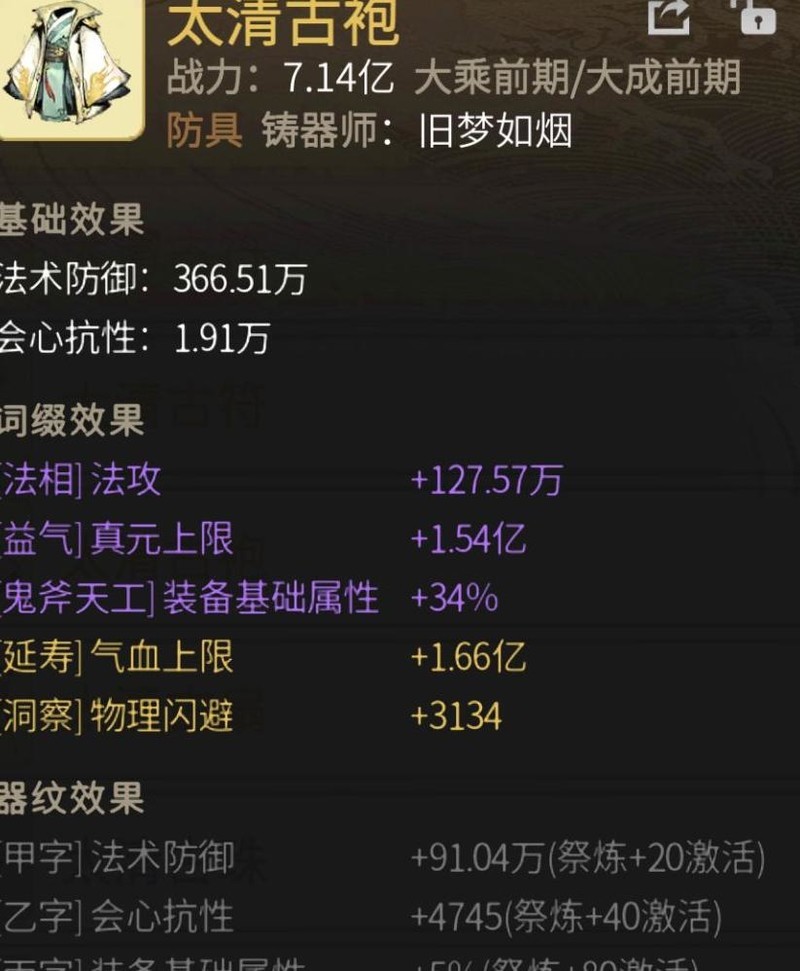 目前所见大乘阶段最理想的防具,词条全面。紫鬼斧虽基础加成略逊于金色,但法相、益气、延寿、洞察等效果显著提升基础属性,对日常切磋与论道裨益颇多。